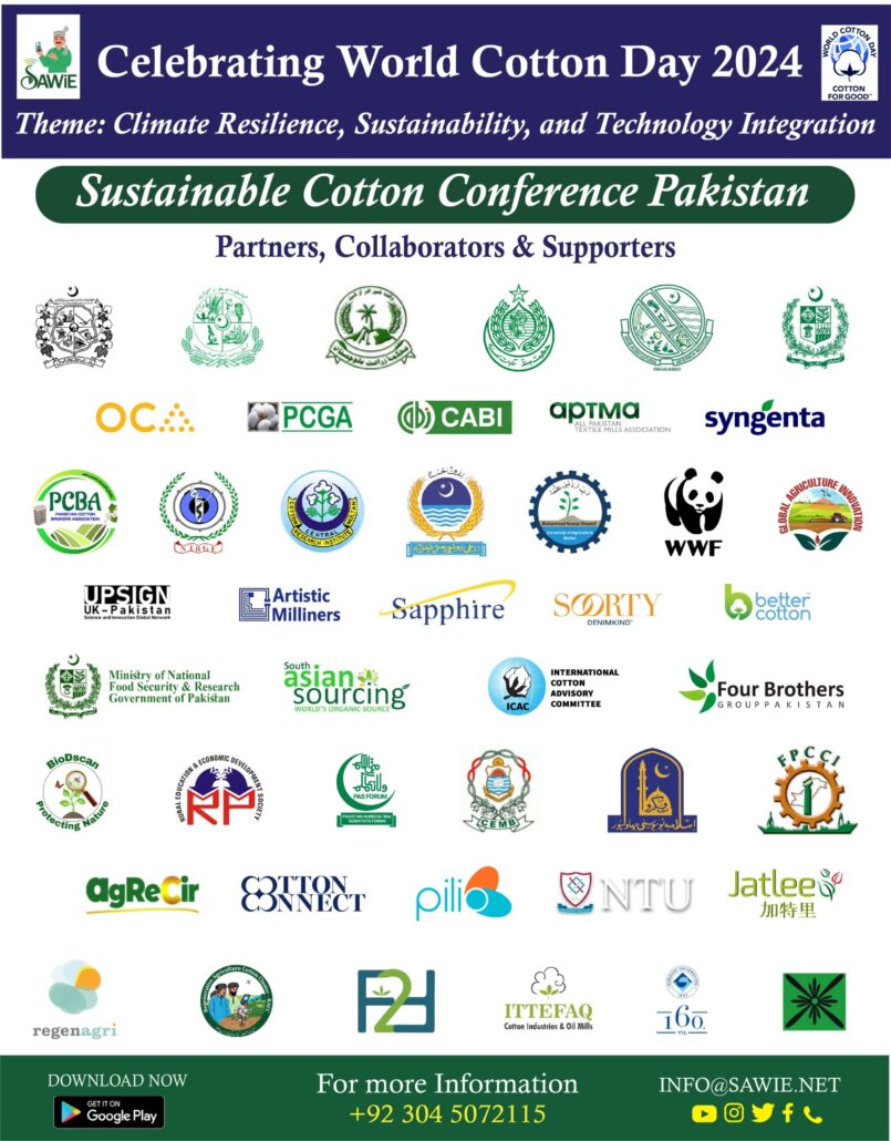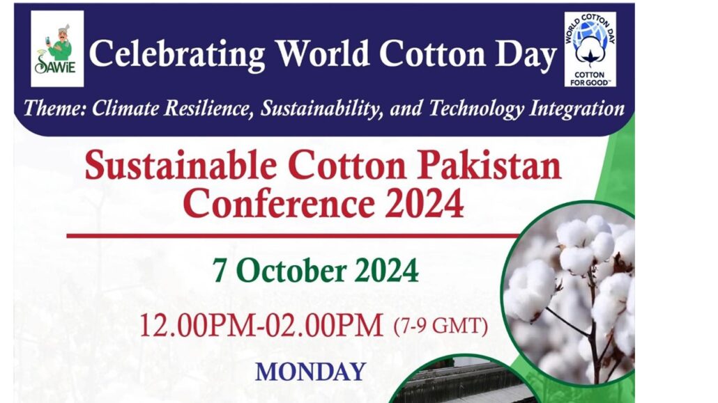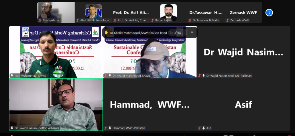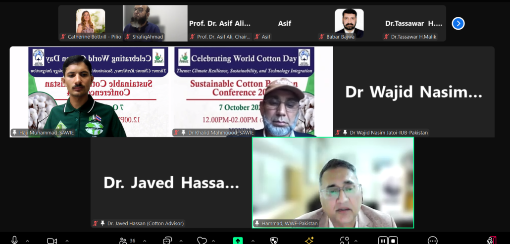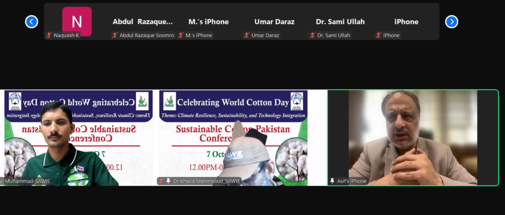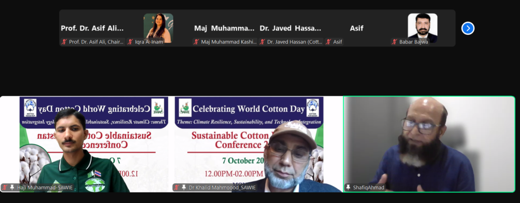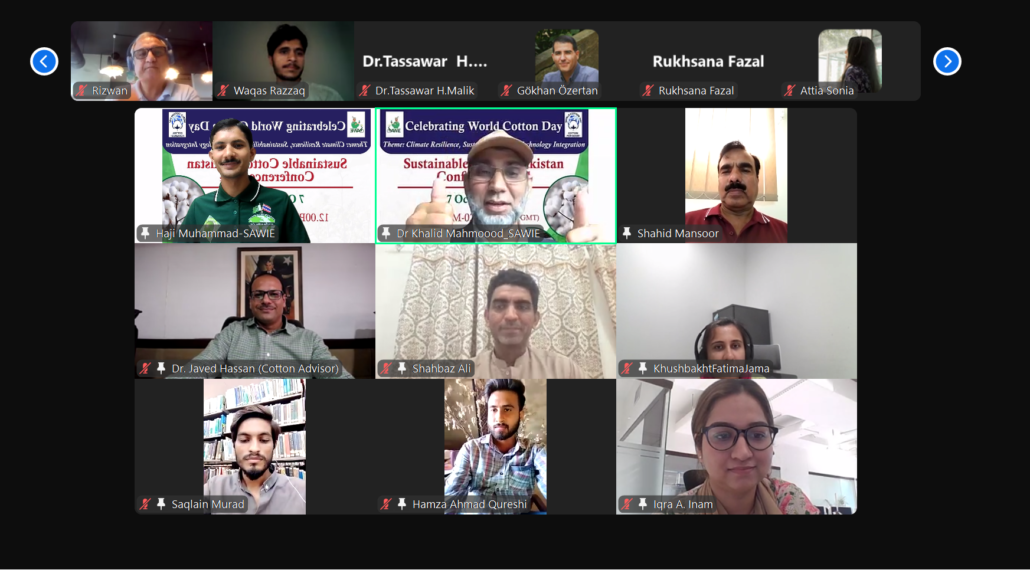 On October 7, 2024, SAWIE celebrated World Cotton Day by hosting the online “Sustainable Cotton Conference Pakistan 2024.” The theme of the conference was centered on climate resilience, sustainability, and technology integration, with the event divided into four comprehensive sessions. The conference was live-streamed on Facebook via Zoom and witnessed active participation from farmers, students, experts, industry leaders, and stakeholders across the cotton value chain.