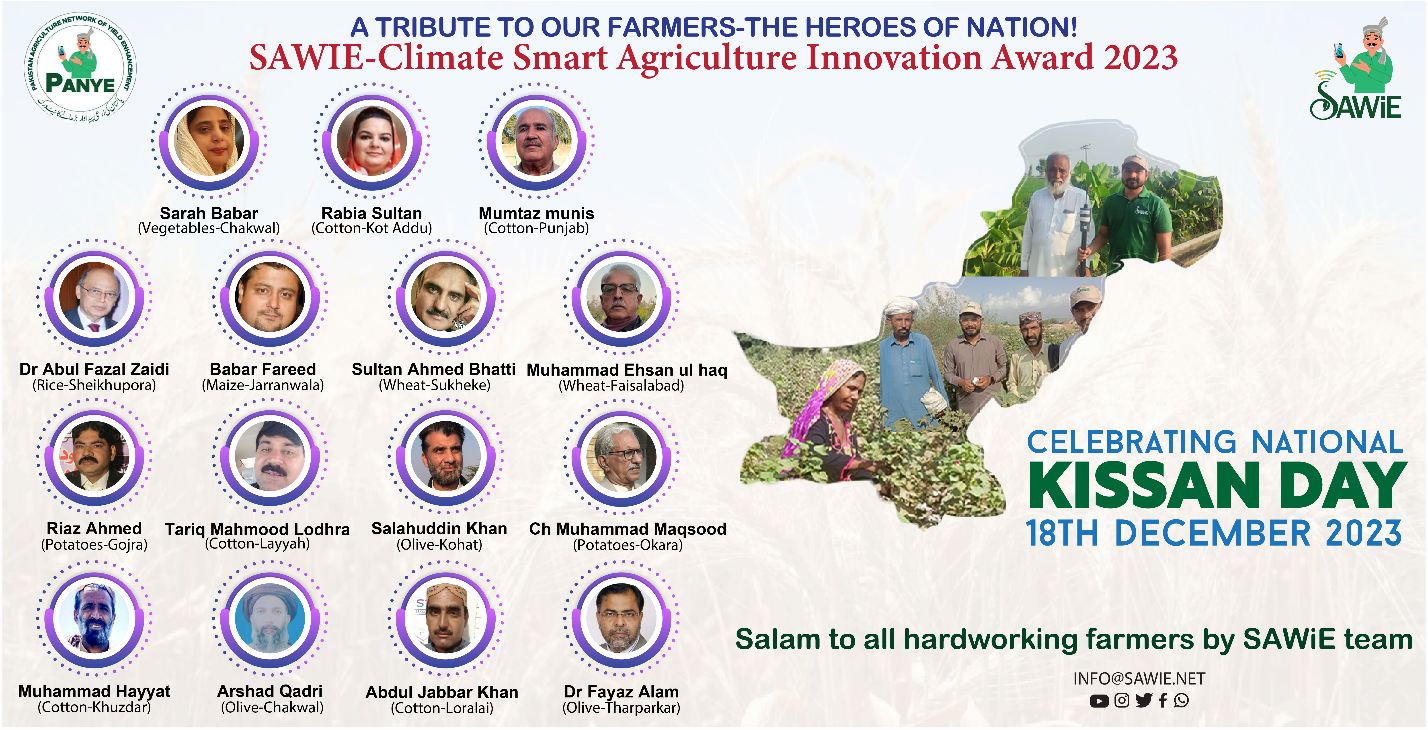 On National Farmers’ Day, SAWIE announced the nomination of 15 industrious farmers from throughout Pakistan for the “SAWIE-Environment Friendly Agriculture Award 2023”. These farmers who have embraced sustainable and environmentally friendly agriculture include Sarah Babar (Vegetables-Chakwal), Rabia Sultan (Cotton-Kot Addu), Dr. Abul Fazal Zaidi (Rice-Sheikhupura), Sultan Ahmed Bhatti (Wheat-Sukkur), Sardar Babar Fareed (Maize-Jaranwala), Tariq Mahmood Lodhran (Cotton-Layyah), Chaudhry Riaz Ahmed (Potatoes-Gujranwala), Salahuddin Khan (Olives-Kohat), Abdul Jabbar Khan (Cotton-Loralai), Chaudhry M. Maqsood (Potatoes-Okara), Muhammad Hayat Khan (Cotton-Khuzdar), Dr. Fayyaz Alam (Olives-Tharparkar), Ehsanullah (Wheat-Faisalabad), Mumtaz Munis (Cotton-Punjab), and Arshad Qadri (Olives-Chakwal). All these farmers will be honored with the award soon.