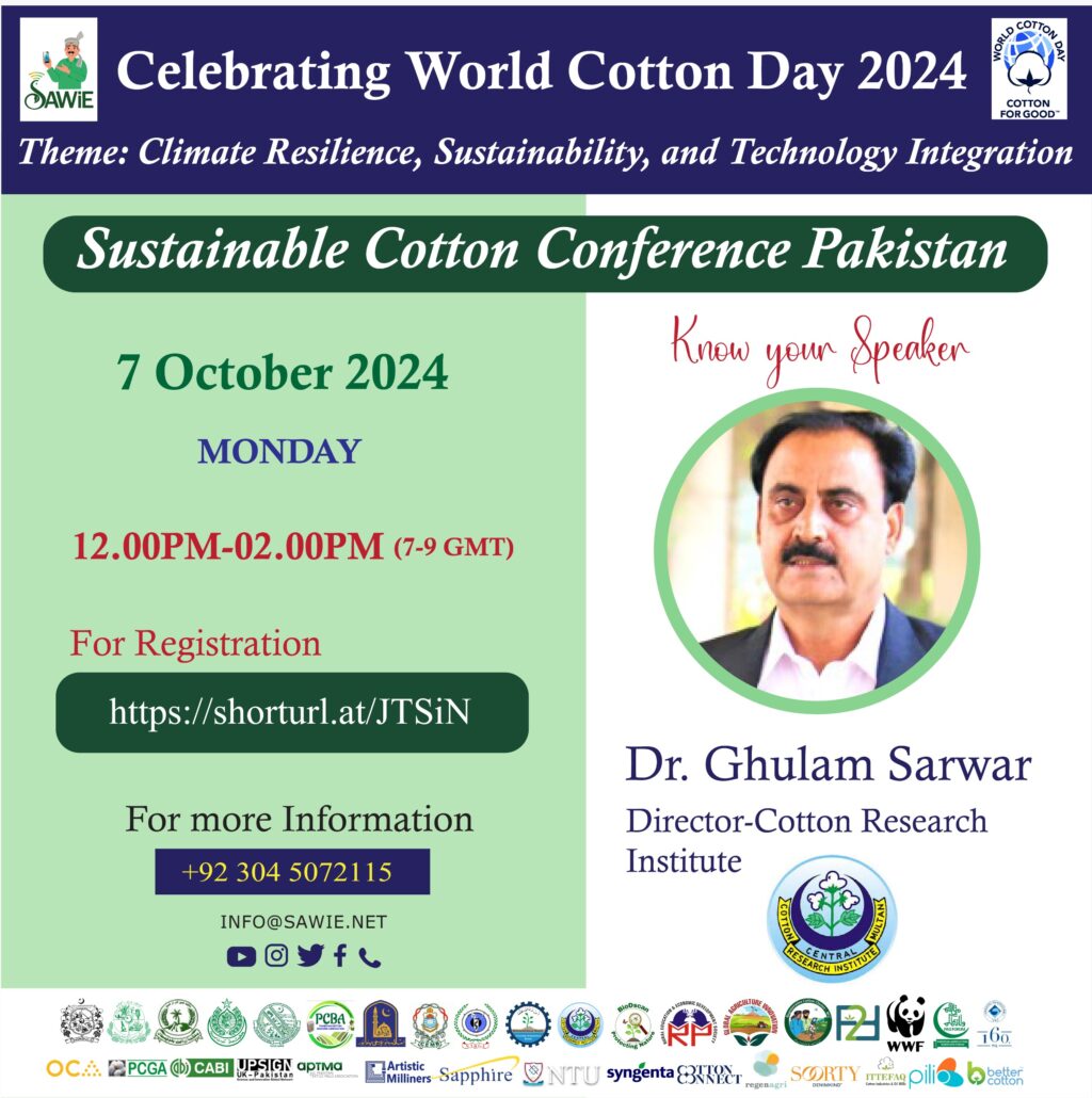 We are excited to announce that Dr. Ghulam Sarwar, Director of the Cotton Research Institute, Government of Punjab, will be joining us as a distinguished speaker at the Sustainable Cotton Conference Pakistan 2024.