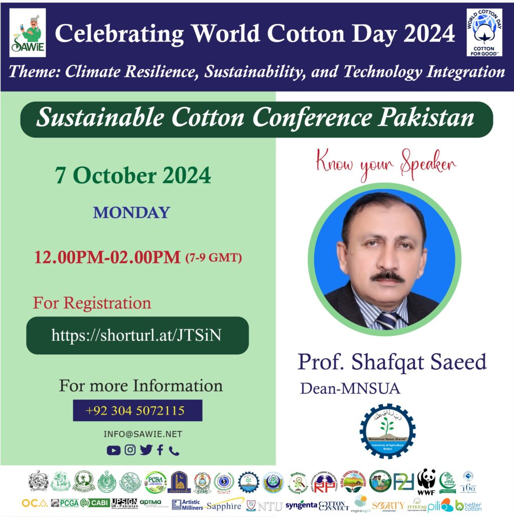 This conference brings together key players, including farmers, industry experts, and policymakers, to discuss the future of sustainable cotton production. Don’t miss the opportunity to learn from Prof. Shafqat Saeed and other distinguished speakers as they share valuable insights into overcoming the challenges and seizing the opportunities that exist within the cotton industry in Pakistan.