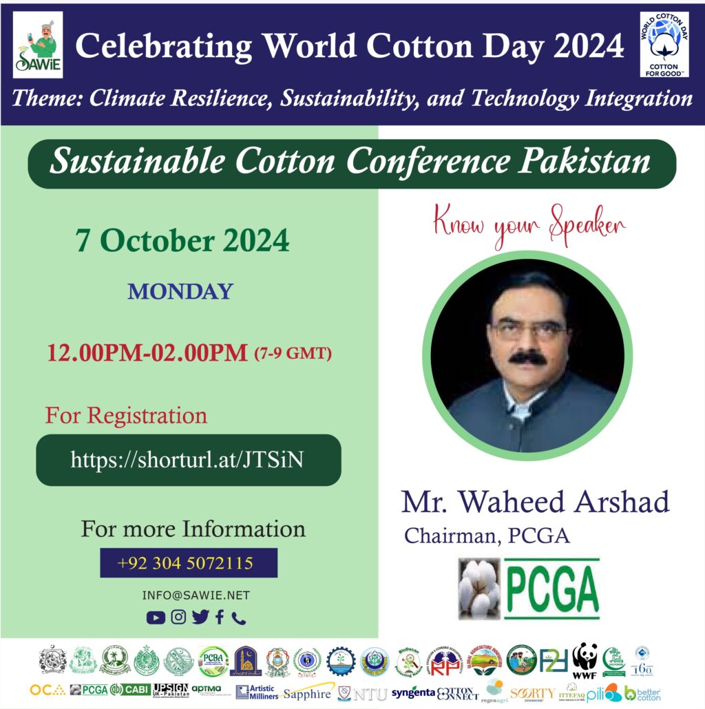 We are excited to announce that Ch Waheed Arshad, Chairman of the Pakistan Cotton Ginners Association (PCGA), will be joining us as a distinguished speaker at the Sustainable Cotton Conference Pakistan 2024 on World Cotton Day, October 7, 2024.
